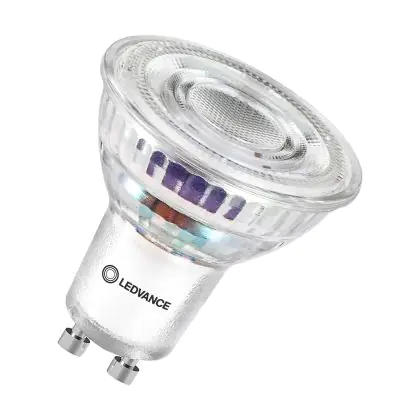 Die Ledvance LED PAR16 GU10 Reflektor 2W 360lm 36D - 827 Extra Warmweiß | Ersatz Für 50W ist eine effiziente GU10 LED-Lampe und der perfekte Ersatz für Ihre konventionelle Halogenlampe mit 50W und einem GU10-Sockel, bei welchem die zwei Stifte einen Abstand von 10 mm zueinander haben. Zudem strahlt das Produkt Licht in der Farbtemperatur 2700K - Extra Warmweiß aus und punktet durch eine lange Lebensdauer.