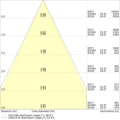 Der Abstrahlwinkel bezeichnet den Winkel, in dem das Licht aus der Lichtquelle ausgestrahlt wird. Er wird in Grad (D) angegeben. Je geringer die Gradzahl des Abstrahlwinkels ist, desto kleiner ist auch der Durchmesser des Lichtkegels, den die Lichtquelle produziert. Beispiel: Wird eine Lampe mit einem Abstrahlwinkel von 60 Grad an der Decke (2,5 m Höhe) angebracht, erzeugt sie einen Lichtkegel von 2,9 Metern Durchmesser. Hat die Lampe hingegen einen Abstrahlwinkel von 120 Grad, beträgt der Lichtkegel 8,7 Meter im Durchmesser. |