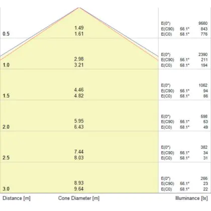 Der Abstrahlwinkel bezeichnet den Winkel, in dem das Licht aus der Lichtquelle ausgestrahlt wird. Er wird in Grad (D) angegeben. Je geringer die Gradzahl des Abstrahlwinkels ist, desto kleiner ist auch der Durchmesser des Lichtkegels, den die Lichtquelle produziert. Beispiel: Wird eine Lampe mit einem Abstrahlwinkel von 60 Grad an der Decke (2,5 m Höhe) angebracht, erzeugt sie einen Lichtkegel von 2,9 Metern Durchmesser. Hat die Lampe hingegen einen Abstrahlwinkel von 120 Grad, beträgt der Lichtkegel 8,7 Meter im Durchmesser. |