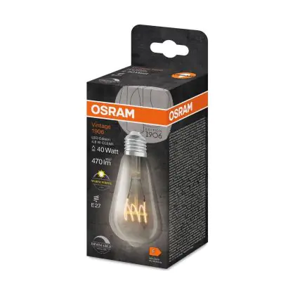 Die Osram Vintage 1906 LED E27 Edison Fadenlampe Klar 4.8W 470lm - 827 Extra Warmweiß | Dimmbar - Ersatz Für 40W ist eine effiziente E27 LED-Lampe mit Retrodesign und der perfekte Ersatz für Ihre konventionellen 40W Lampen mit E27. Zudem strahlt sie Licht in der Farbtemperatur 2700K - Extra Warmweiß aus und punktet durch eine lange Lebensdauer.